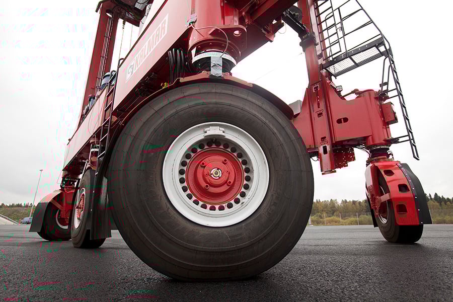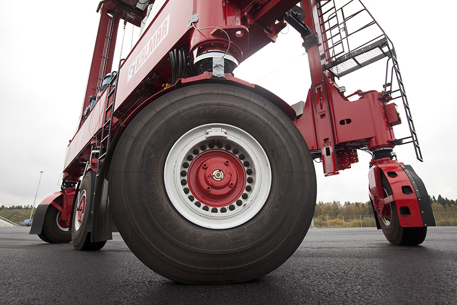 The new wheel setup allows Kalmar hybrid and electric shuttle carriers to manoeuvre with greatly increased precision and speed. Each wheel can be individually controlled and there are four different steering modes according to the operating situation. The radical increase in agility enables shorter work cycles and reduces terminal congestion.