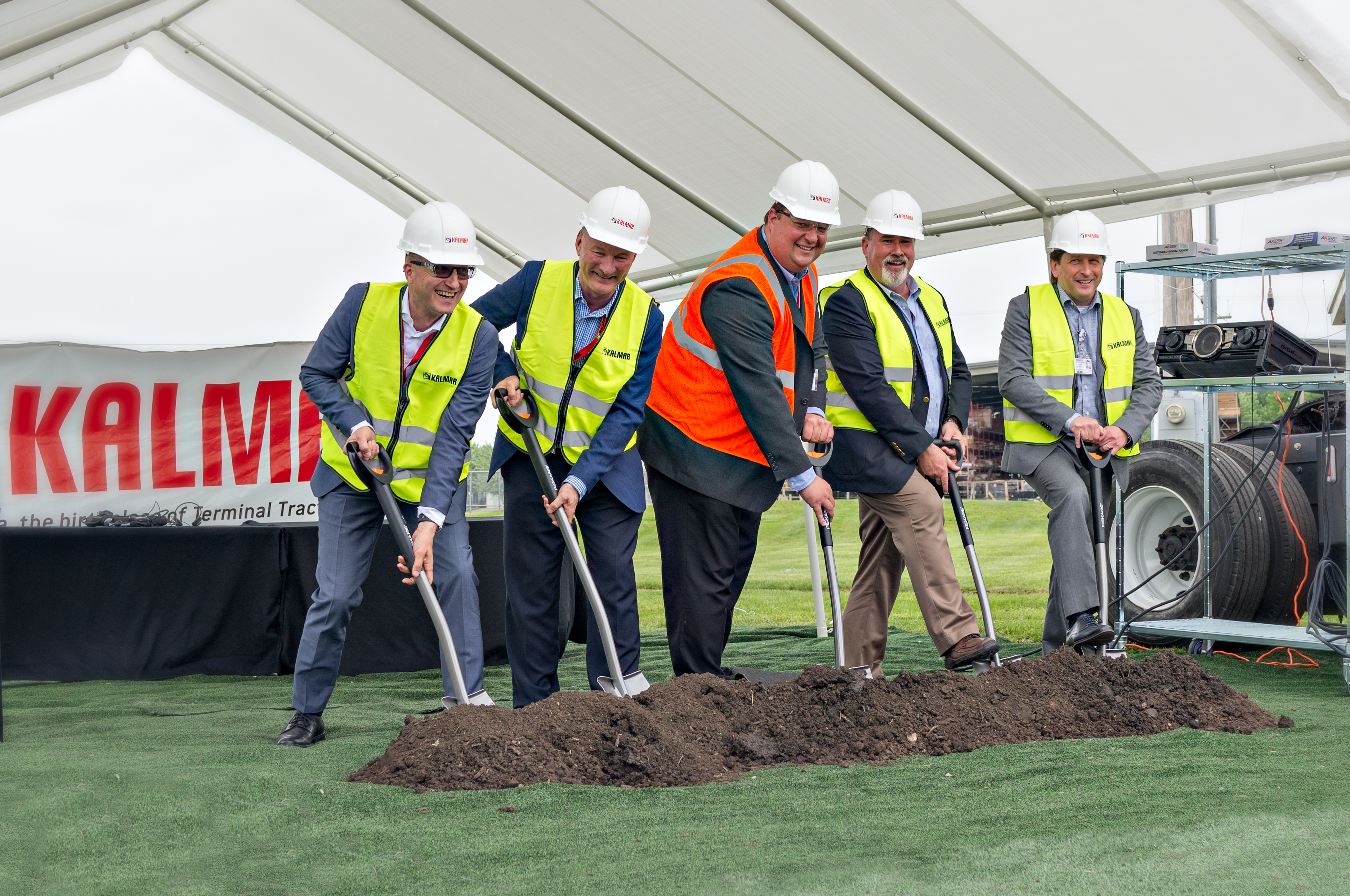 In the photo: Kalmar celebrated yesterday at its manufacturing plant in Ottawa, Kansas, USA, with Olli Isotalo, President, Kalmar, Mika Vehviläinen, President and CEO, Cargotec, Alan Wilson, Director, Operations, Chris Booth, Vice President, Terminal Tractors and Dan Pettersson, Senior Vice President, Mobile Equipment officially breaking ground at the site.